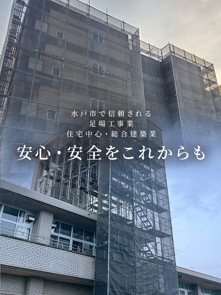 くさび式足場をメインに、さまざまな足場工事を行っている当社。物件を問わずに対応可能ですので、水戸市近隣で足場屋をお探しでしたら、ぜひご依頼ください。お見積り無料でお伺いいたします。